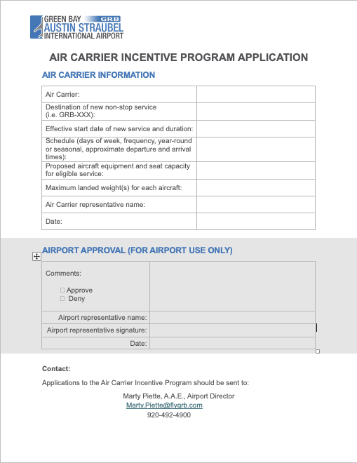 In order to encourage new and/or additional air service to Green Bay Austin Straubel International Airport (GRB or the Airport) the Airport is launching the following Air Carrier Incentive Program (ACIP) to reduce operational costs for airlines and provide promotional support for new routes.